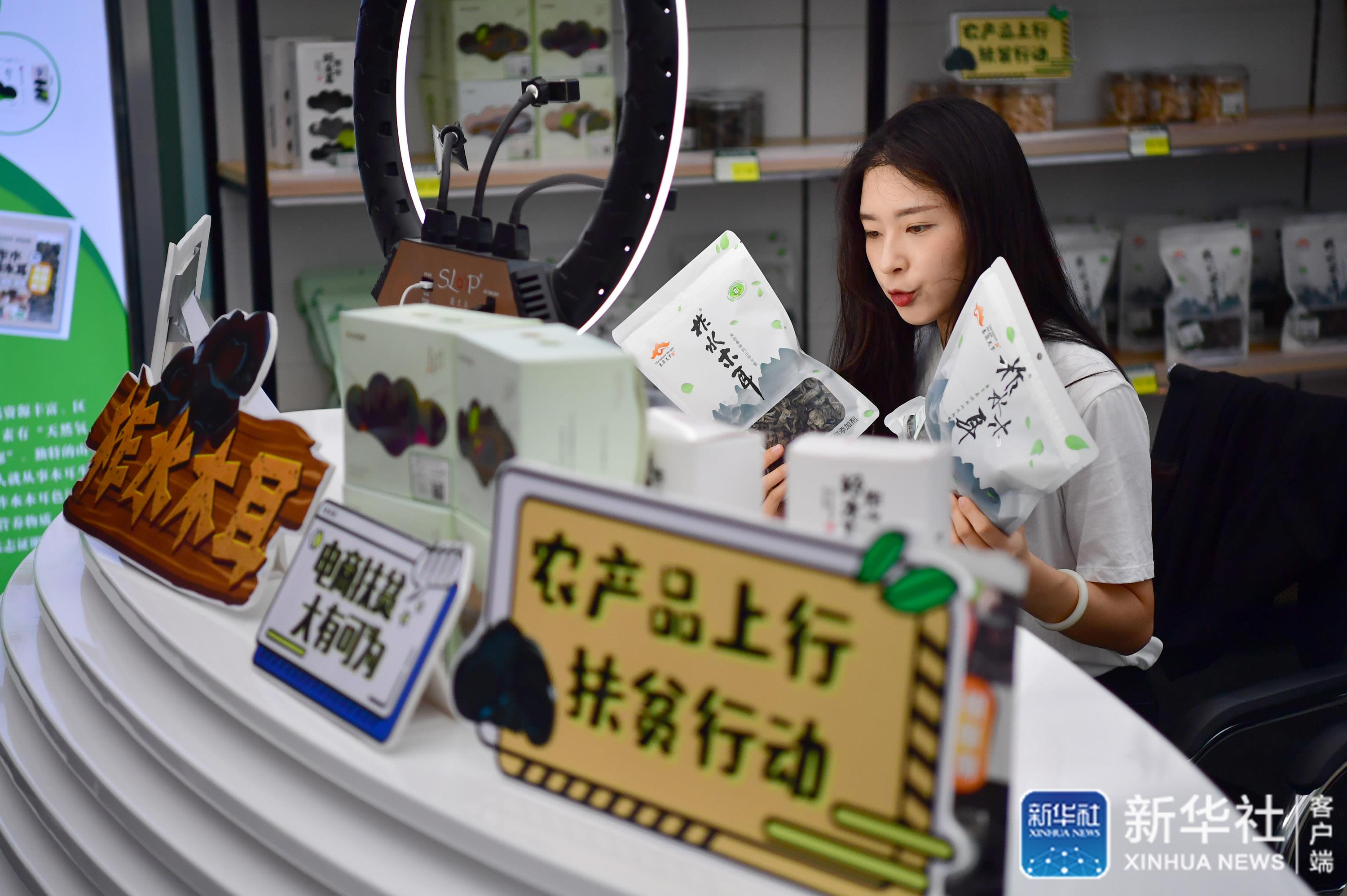 7月21日,在陜西柞水縣小嶺鎮(zhèn)金米村木耳展銷(xiāo)中心內(nèi),電商主播何錦漪通過(guò)直播售賣(mài)柞水木耳。新華社記者 邵瑞 攝