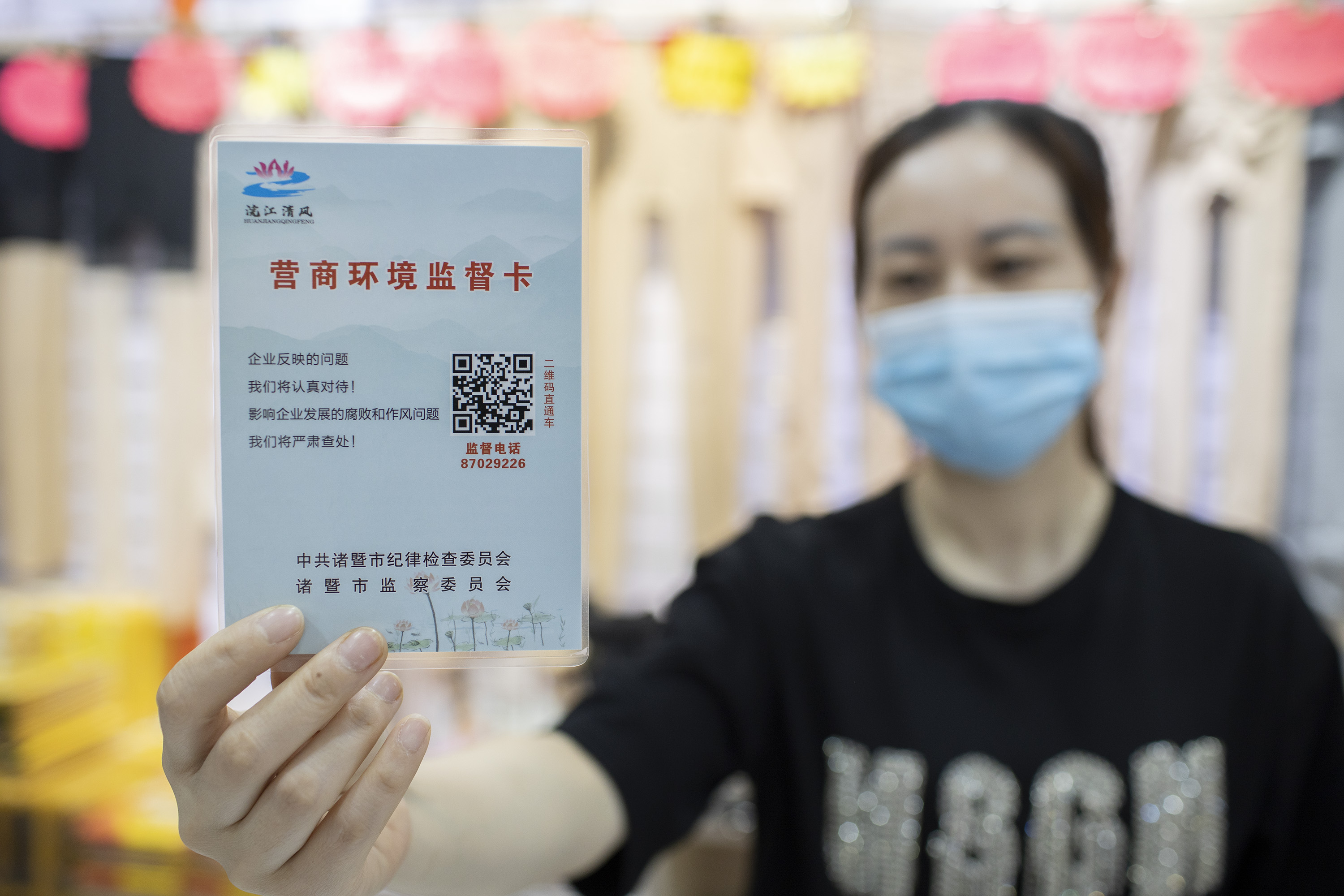 5月12日,浙江諸暨市一經(jīng)營(yíng)戶(hù)在展示“營(yíng)商環(huán)境監(jiān)督卡”。諸暨市推出“營(yíng)商環(huán)境監(jiān)督卡”,助力復(fù)工復(fù)產(chǎn),服務(wù)保障經(jīng)濟(jì)穩(wěn)健發(fā)展。新華社發(fā)(郭斌 攝)