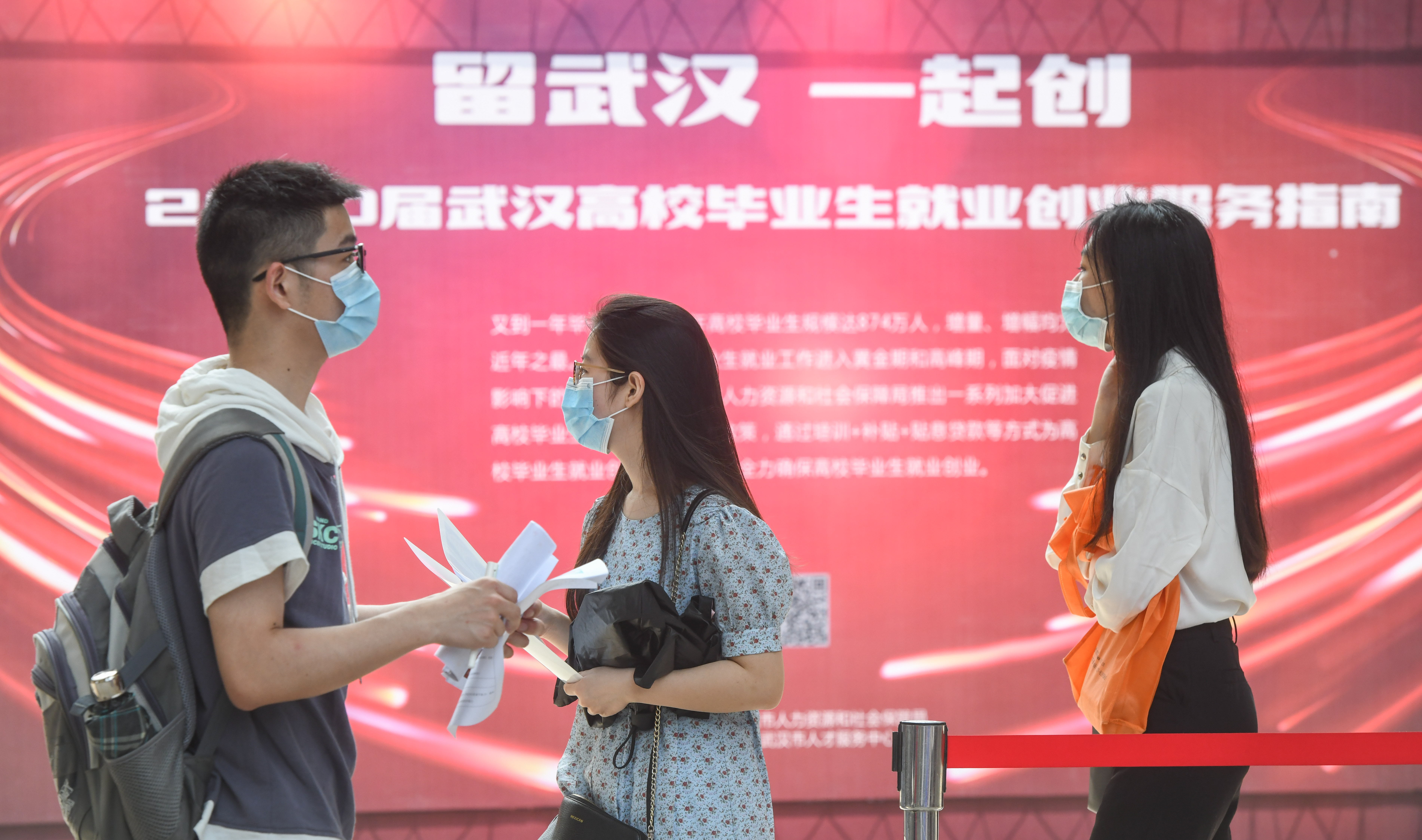 6月1日,在位于湖北武漢市的江漢大學(xué)校園內(nèi),幾名求職者在參加疫情后武漢舉行的首場(chǎng)高校畢業(yè)生線下招聘會(huì)。新華社記者 程敏 攝