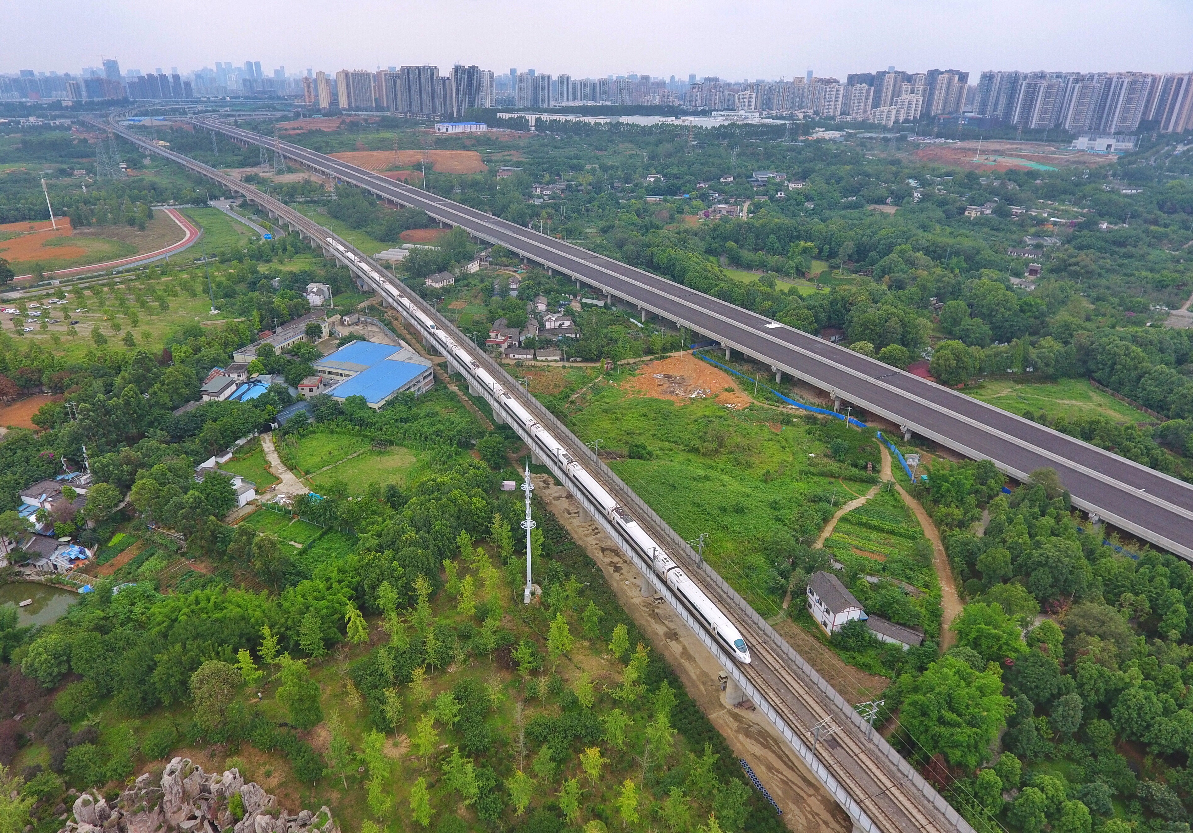 7月22日,高鐵列車(chē)在成渝客專(zhuān)鐵路線上行駛(無(wú)人機(jī)照片)。新華社記者 劉坤 攝