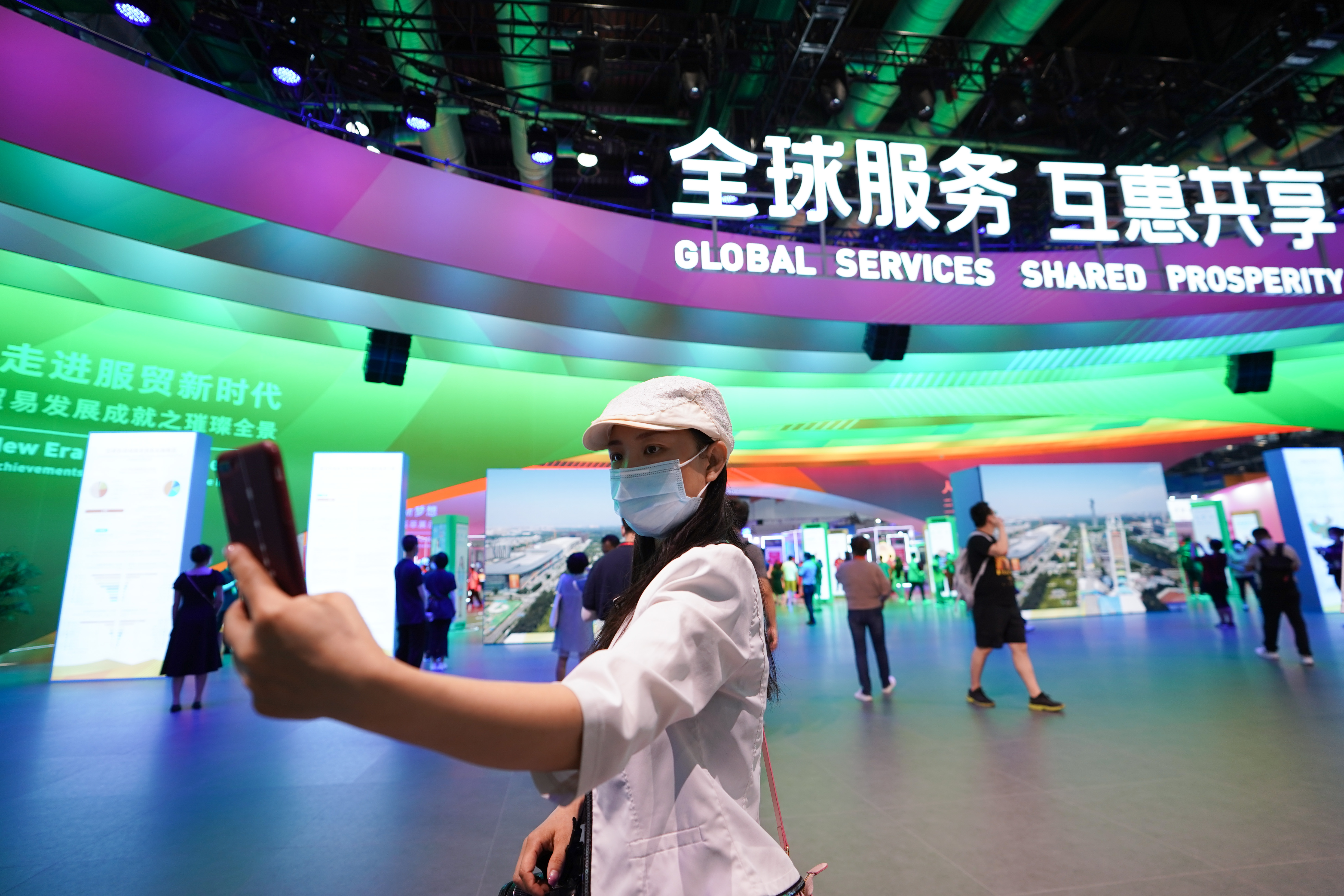9月6日,參觀者在2020年中國(guó)國(guó)際服務(wù)貿(mào)易交易會(huì)綜合展區(qū)自拍。新華社記者 鞠煥宗 攝