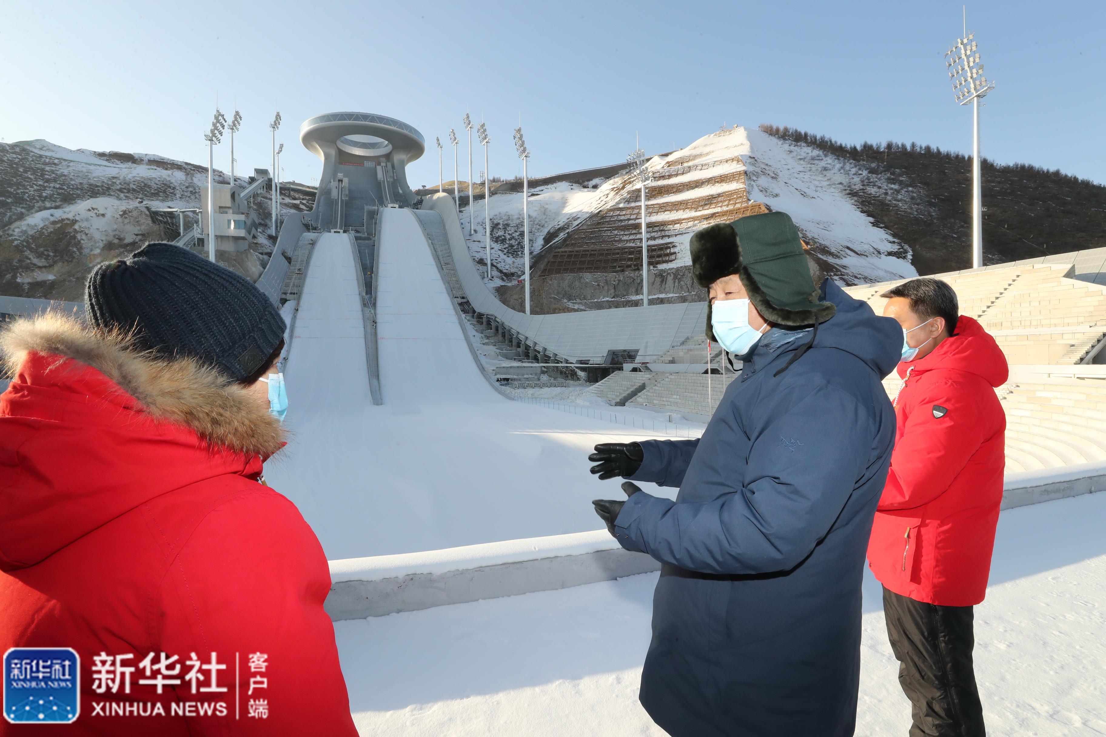 ↑1月18日至20日,中共中央總書記、國家主席、中央軍委主席習近平在北京、河北考察,并主持召開北京2022年冬奧會和冬殘奧會籌辦工作匯報會。這是19日下午,習近平在張家口賽區(qū)國家跳臺滑雪中心,察看跳臺滑雪運動員訓練演示。 新華社記者 鞠鵬 攝