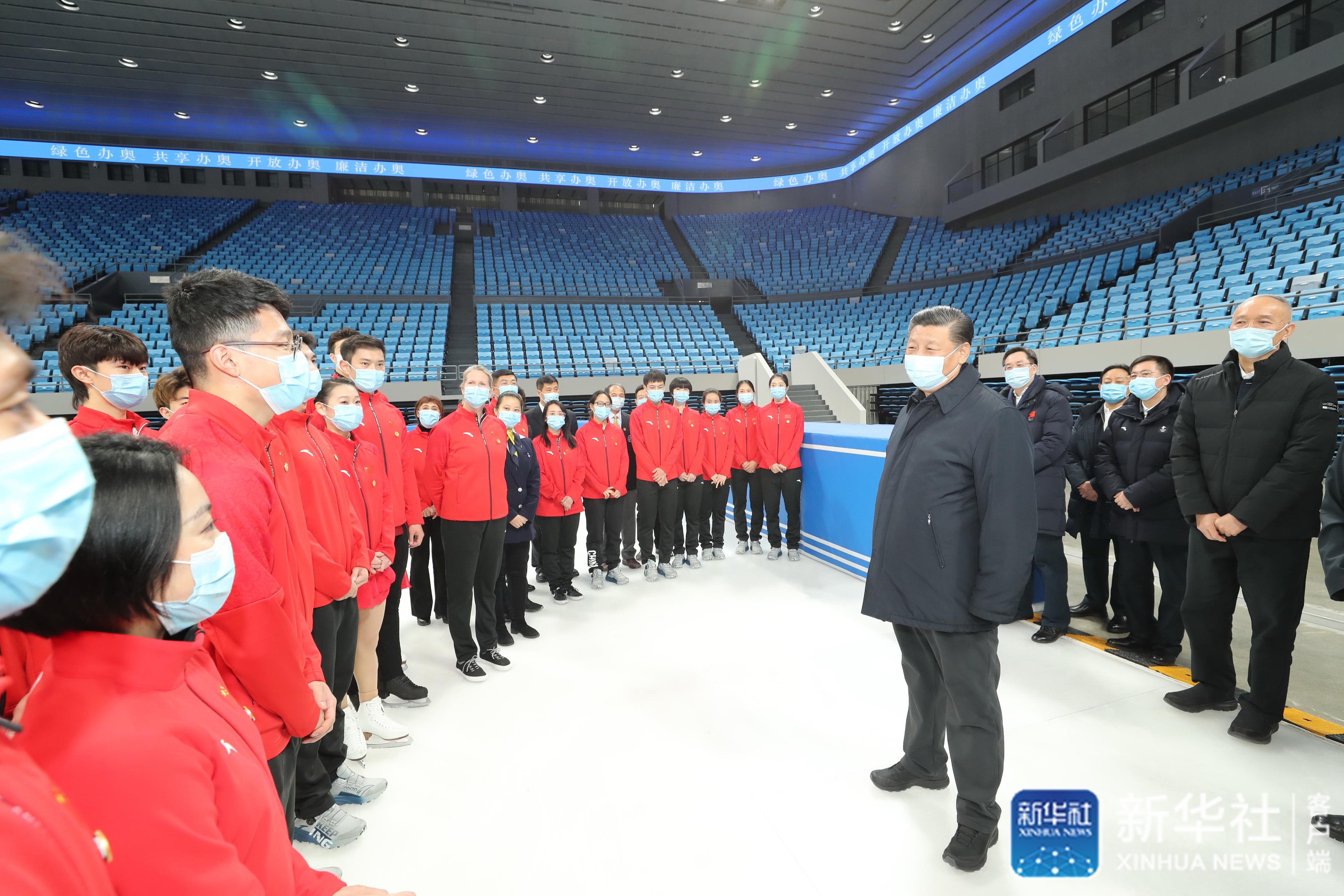 ↑1月18日至20日,中共中央總書記、國家主席、中央軍委主席習近平在北京、河北考察,并主持召開北京2022年冬奧會和冬殘奧會籌辦工作匯報會。這是18日上午,習近平在位于北京市海淀區(qū)的首都體育館,同國家花樣滑冰隊和短道速滑隊運動員、教練員等親切交流。新華社記者 鞠鵬 攝