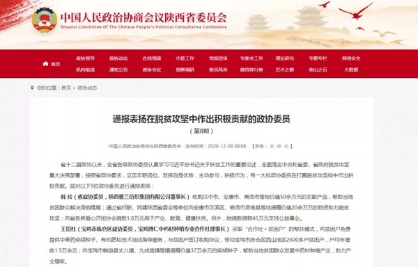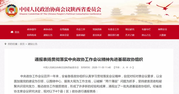 中央政協(xié)工作會(huì)議召開一年多來,陜西全省各級(jí)政協(xié)組織認(rèn)真貫徹落實(shí)會(huì)議精神,堅(jiān)持建言資政和凝聚共識(shí)雙向發(fā)力,推動(dòng)政協(xié)工作提質(zhì)增效,形成了許多新的經(jīng)驗(yàn)和成果,涌現(xiàn)出了一批先進(jìn)基層政協(xié)組織。2020年11月2日,省政協(xié)十二屆四十七次主席會(huì)議決定通報(bào)表揚(yáng)貫徹落實(shí)中央政協(xié)工作會(huì)議精神先進(jìn)基層政協(xié)組織,金臺(tái)區(qū)政協(xié)、富平縣政協(xié)、富縣政協(xié)和柞水縣政協(xié)4家縣(區(qū))政協(xié)組織榜上有名。