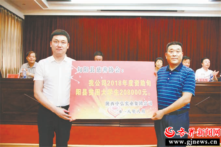 2018年8月,省政協(xié)委員、陜西中弘實(shí)業(yè)集團(tuán)有限公司董事長(zhǎng)徐浩向旬陽(yáng)縣貧困大學(xué)生捐贈(zèng)善款。