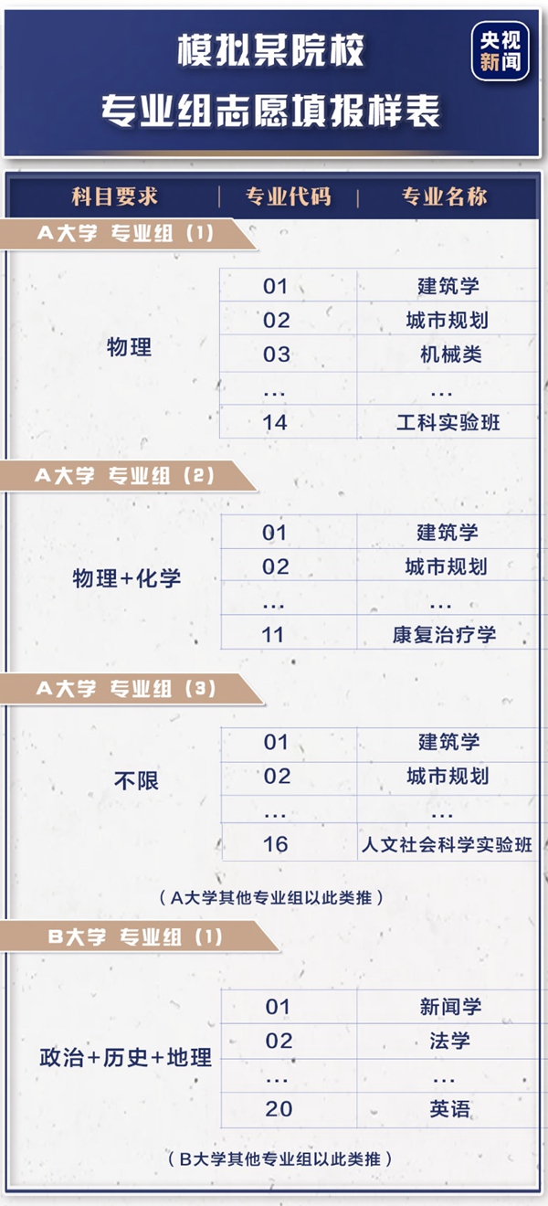 學(xué)生在填報志愿表時,按照“院校專業(yè)組+專業(yè)”的方式填寫,只要選考科目符合要求,學(xué)生就可以在志愿表第1行填寫A大學(xué)專業(yè)組(1)+該專業(yè)組后面的幾個專業(yè),第2行填寫A大學(xué)專業(yè)組(2)+該專業(yè)組后面的幾個專業(yè),以此類推。