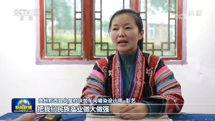 貴州黔西縣化屋村扶貧車間蠟染設(shè)計(jì)師 彭藝:把我們民族產(chǎn)業(yè)做大做強(qiáng),讓我們苗族同胞的生活,過得像我們蠟染刺繡一樣精彩。