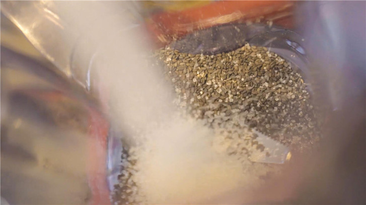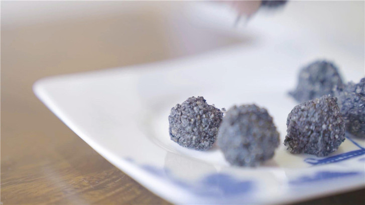 將炒熟的黑芝麻加入白砂糖放入研磨機(jī)。