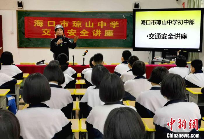 海口公安交警進校園開展“交通安全第一課”活動。??诮痪﹫D