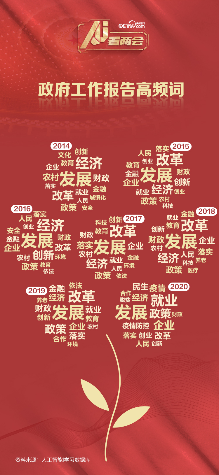 依托人工智能I學(xué)習(xí)數(shù)據(jù)庫,央視網(wǎng)人工智能編輯部還分析了2014年以來每一份政府工作報(bào)告的高頻詞。