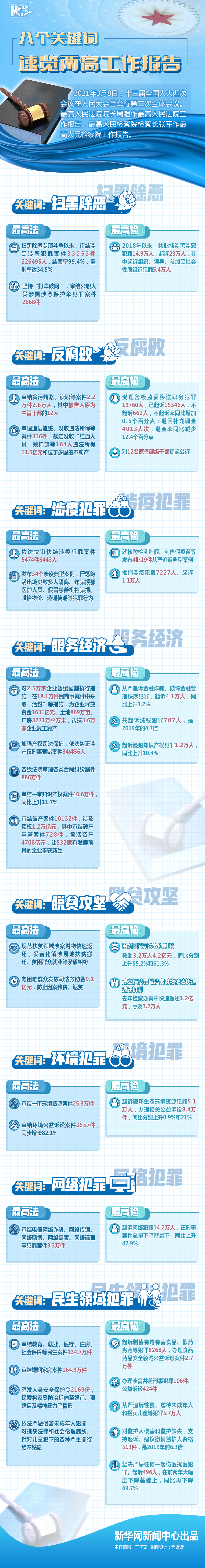 8日提請十三屆全國人大四次會議審議的兩高報告,交出一份滿滿的成績單。掃黑除惡“打傘破網(wǎng)”、嚴(yán)懲腐敗守護(hù)平安、加強民生司法保障……一串串?dāng)?shù)字勾勒出法治中國建設(shè)的亮點。