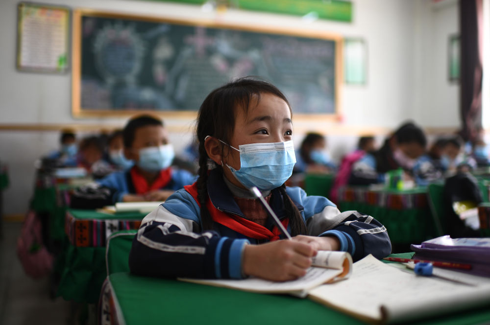 ↑ 玉樹市第三完全小學(xué)二年級一班學(xué)生求永藏嘎在上課(2020年4月9日攝)。