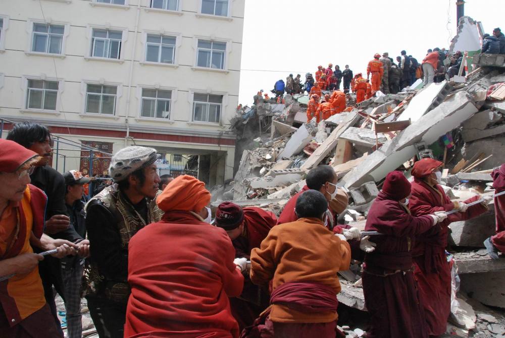 ↓ 圖為2010年4月16日,救援人員在結(jié)古寺賓館進(jìn)行救援。