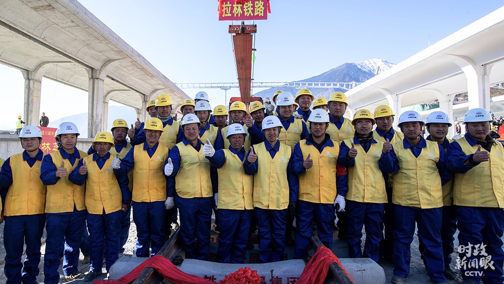 △2020年12月31日,西藏林芝,中鐵十一局施工人員慶祝川藏鐵路拉薩至林芝段軌道全線鋪通。