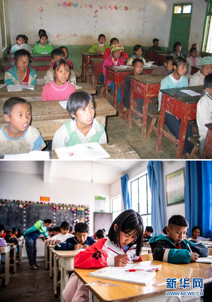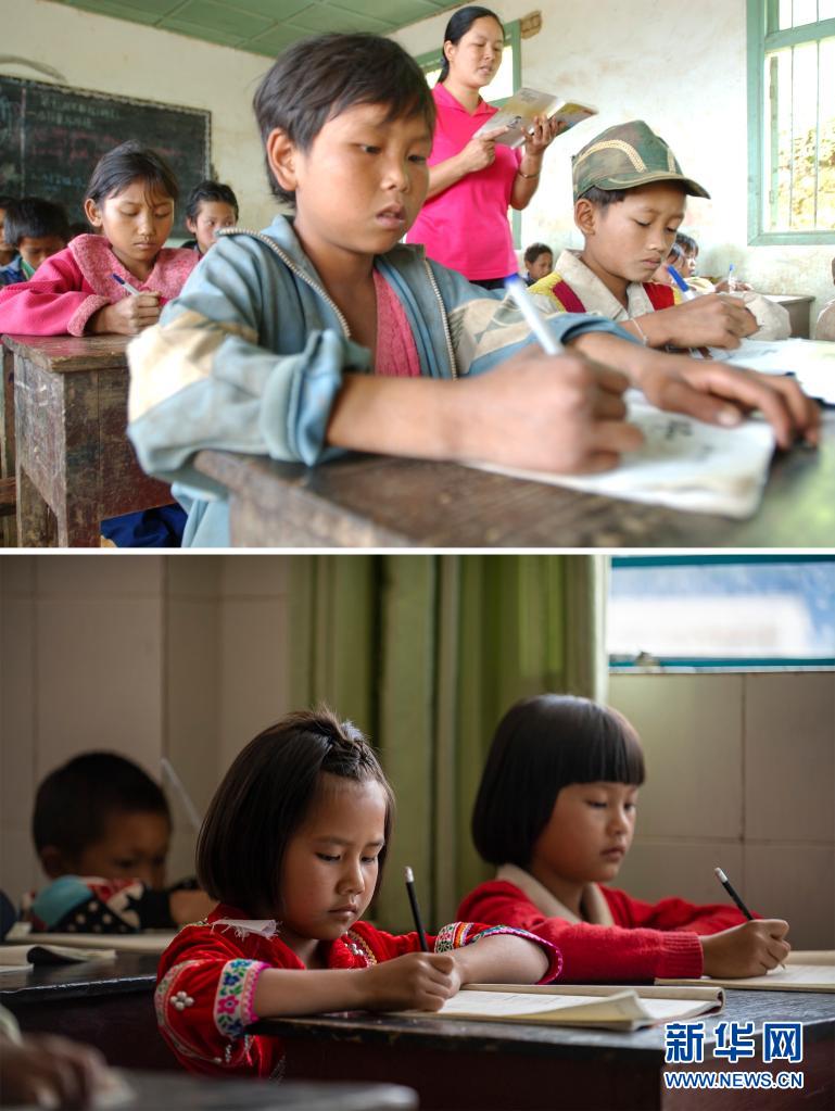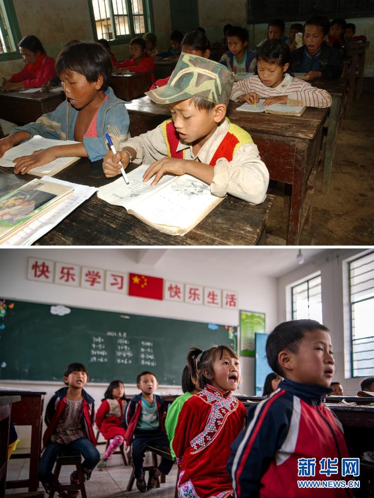 這張拼版照片的上圖:2003年12月6日,云南省瀾滄拉祜族自治縣富邦鄉(xiāng)半山小學(xué)的孩子們?cè)谏险n(新華社記者 李銀 攝);下圖:2021年3月2日,云南省瀾滄拉祜族自治縣富邦鄉(xiāng)半山小學(xué)已撤并到富邦鄉(xiāng)中心完小,這是孩子們?cè)诮淌依锷险n(新華社記者 江文耀 攝)。新華社發(fā)