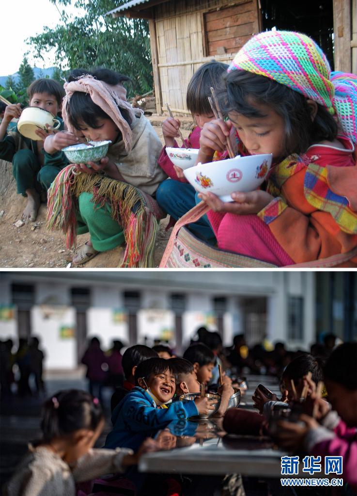 這張拼版照片的上圖:2003年12月6日,云南省瀾滄拉祜族自治縣富邦鄉(xiāng)半山村小學(xué)的孩子們?cè)诔燥垼ㄐ氯A社記者 李銀 攝);下圖:2021年3月2日,云南省瀾滄拉祜族自治縣富邦鄉(xiāng)半山村小學(xué)已撤并到富邦鄉(xiāng)中心完小,這是孩子們?cè)诔燥垼ㄐ氯A社記者 江文耀 攝)。新華社發(fā)
