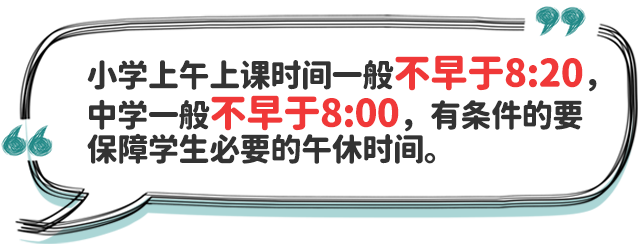 三、統(tǒng)籌安排學校作息時間。省級教育行政部門要從保證學生充足睡眠需要出發(fā),結(jié)合實際情況合理確定中小學作息時間。小學上午上課時間一般不早于8:20,中學一般不早于8:00;學校不得要求學生提前到校參加統(tǒng)一的教育教學活動,對于個別因家庭特殊情況提前到校學生,學校應提前開門、妥善安置;合理安排課間休息和下午上課時間,有條件的地方和學校應保障學生必要的午休時間;寄宿制學校要合理安排作息時間,確保學生達到規(guī)定睡眠時間要求。
