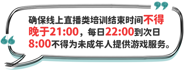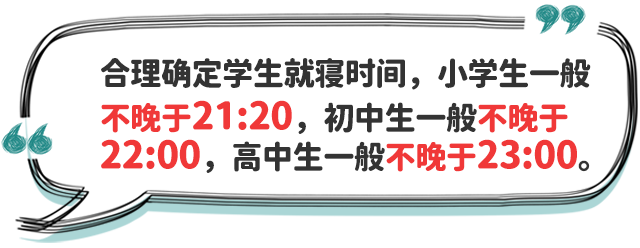 五、合理安排學生就寢時間。中小學校要指導家長和學生,制訂學生作息時間表,在保證學生睡眠時間要求前提下,結(jié)合學生個體睡眠狀況、午休時間等實際,合理確定學生晚上就寢時間,促進學生自主管理、規(guī)律作息、按時就寢。小學生就寢時間一般不晚于21:20;初中生一般不晚于22:00;高中生一般不晚于23:00。個別學生經(jīng)努力到就寢時間仍未完成作業(yè)的,家長應督促按時就寢不熬夜,確保充足睡眠;教師應有針對性幫助學生分析原因,加強學業(yè)輔導,提出改進策略,如有必要可調(diào)整作業(yè)內(nèi)容和作業(yè)量。各地教育部門要會同相關部門切實加強對轄區(qū)內(nèi)注冊登記或備案的線上培訓網(wǎng)課平臺、網(wǎng)絡游戲的規(guī)范管理,采取技術(shù)手段進行監(jiān)管,確保線上直播類培訓活動結(jié)束時間不得晚于21:00,每日22:00到次日8:00不得為未成年人提供游戲服務。