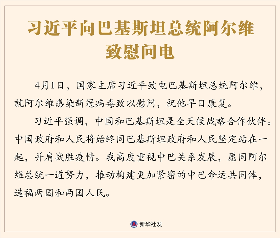 新華社北京4月2日電 4月1日,國家主席習近平致電巴基斯坦總統(tǒng)阿爾維,就阿爾維感染新冠病毒致以慰問,祝他早日康復。