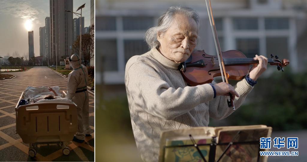 這是一張拼版照片,左圖為:2020年3月5日傍晚,在湖北省武漢大學(xué)人民醫(yī)院東院,復(fù)旦大學(xué)附屬中山醫(yī)院支援湖北醫(yī)療隊(duì)醫(yī)生在護(hù)送患者王欣做CT的途中停下,讓住院近一個(gè)月的老人欣賞久違的日落(甘俊超 攝);右圖為:3月24日,“看夕陽(yáng)的老人”王欣在東西湖區(qū)園藝花城小區(qū)內(nèi)拉小提琴(新華社記者熊琦攝)。新華社發(fā)
