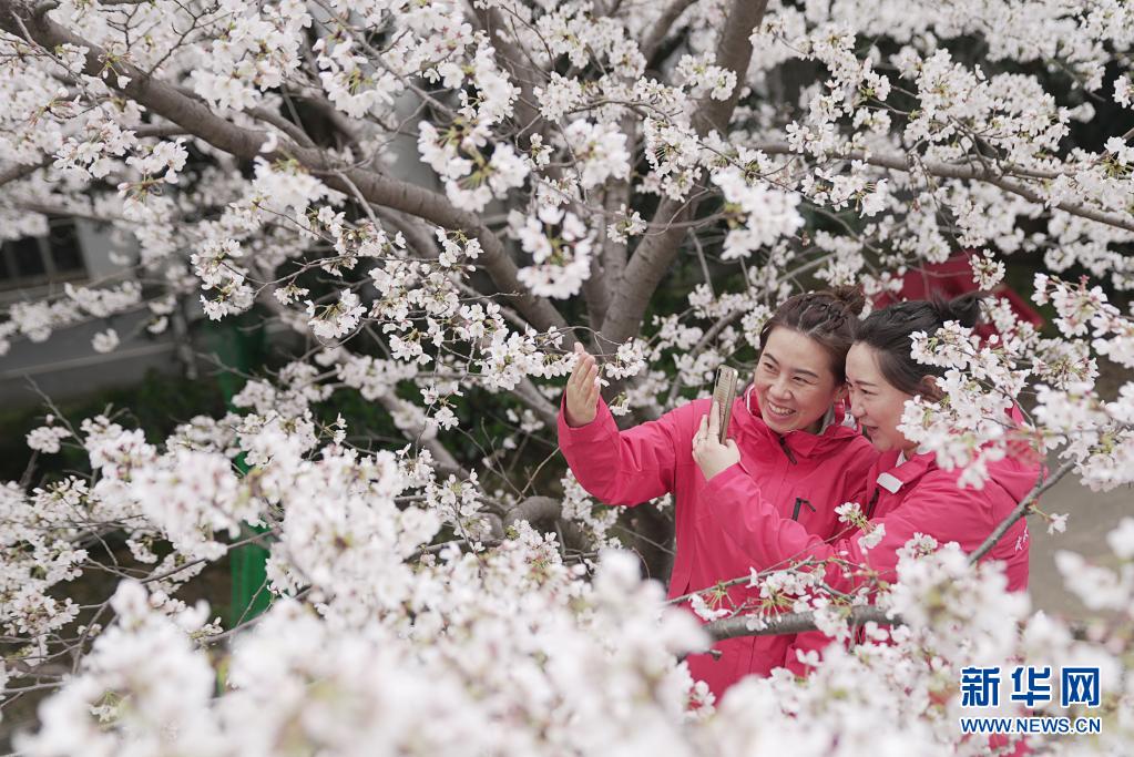 3月13日,武漢雷神山醫(yī)院醫(yī)護(hù)人員在櫻花樹(shù)下賞花。當(dāng)日,武漢大學(xué)抗疫醫(yī)護(hù)人員賞櫻專場(chǎng)啟動(dòng),來(lái)自全國(guó)各地的援鄂抗疫英雄在櫻花樹(shù)下重逢,盡享櫻花之約。新華社記者 熊琦 攝