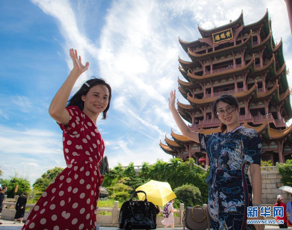 2020年8月7日,受邀來(lái)湖北旅游的海南援鄂醫(yī)療隊(duì)員陳小妹(左)與同事計(jì)超在黃鶴樓景區(qū)觀光。湖北省組織“與愛(ài)同行 惠游湖北”活動(dòng),陸續(xù)邀請(qǐng)?jiān)踽t(yī)護(hù)人員代表以及湖北醫(yī)護(hù)人員、社區(qū)工作者、志愿者等走進(jìn)景區(qū),飽覽荊楚風(fēng)貌。新華社記者 肖藝九 攝