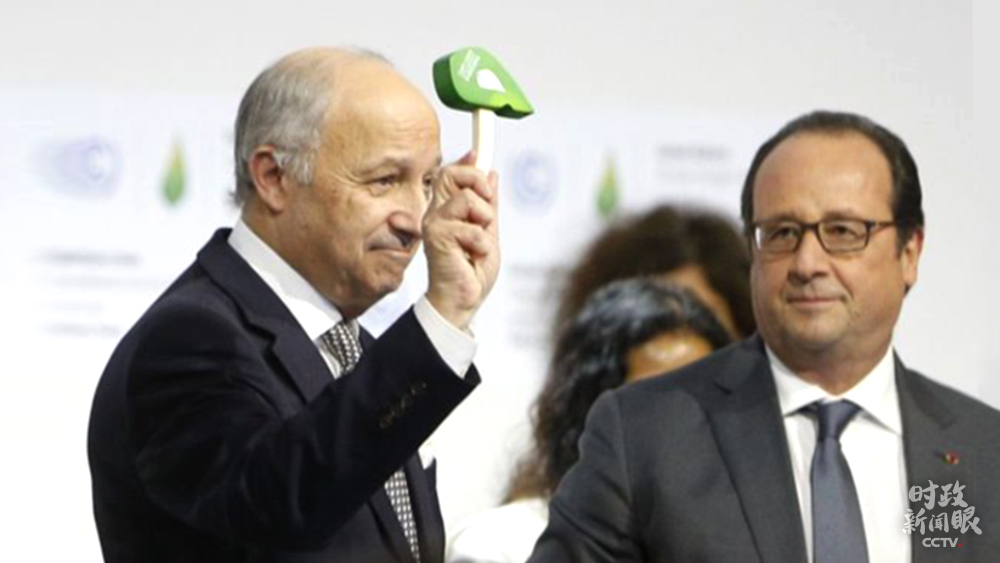 △2015年12月12日,巴黎氣候變化大會(huì)主席、法國(guó)外長(zhǎng)法比尤斯舉起帶有大會(huì)標(biāo)志的綠色小錘,宣告里程碑式的《巴黎協(xié)定》誕生。(資料圖)