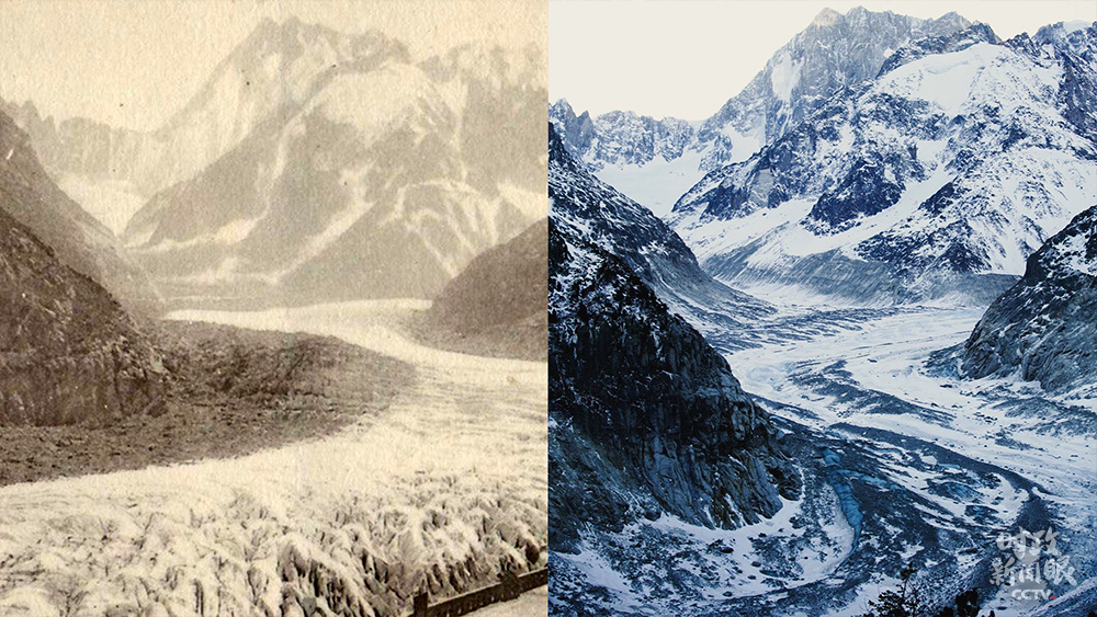 △去年2月,馬克龍總統(tǒng)到訪位于法國(guó)阿爾卑斯山勃朗峰山區(qū)的冰海冰川。作為法國(guó)最長(zhǎng)的冰川,近些年它因全球暖化而急劇萎縮。這是馬克龍總統(tǒng)在個(gè)人社交媒體上發(fā)布的冰川消融對(duì)比照片(左為1910年,右為2020年)。