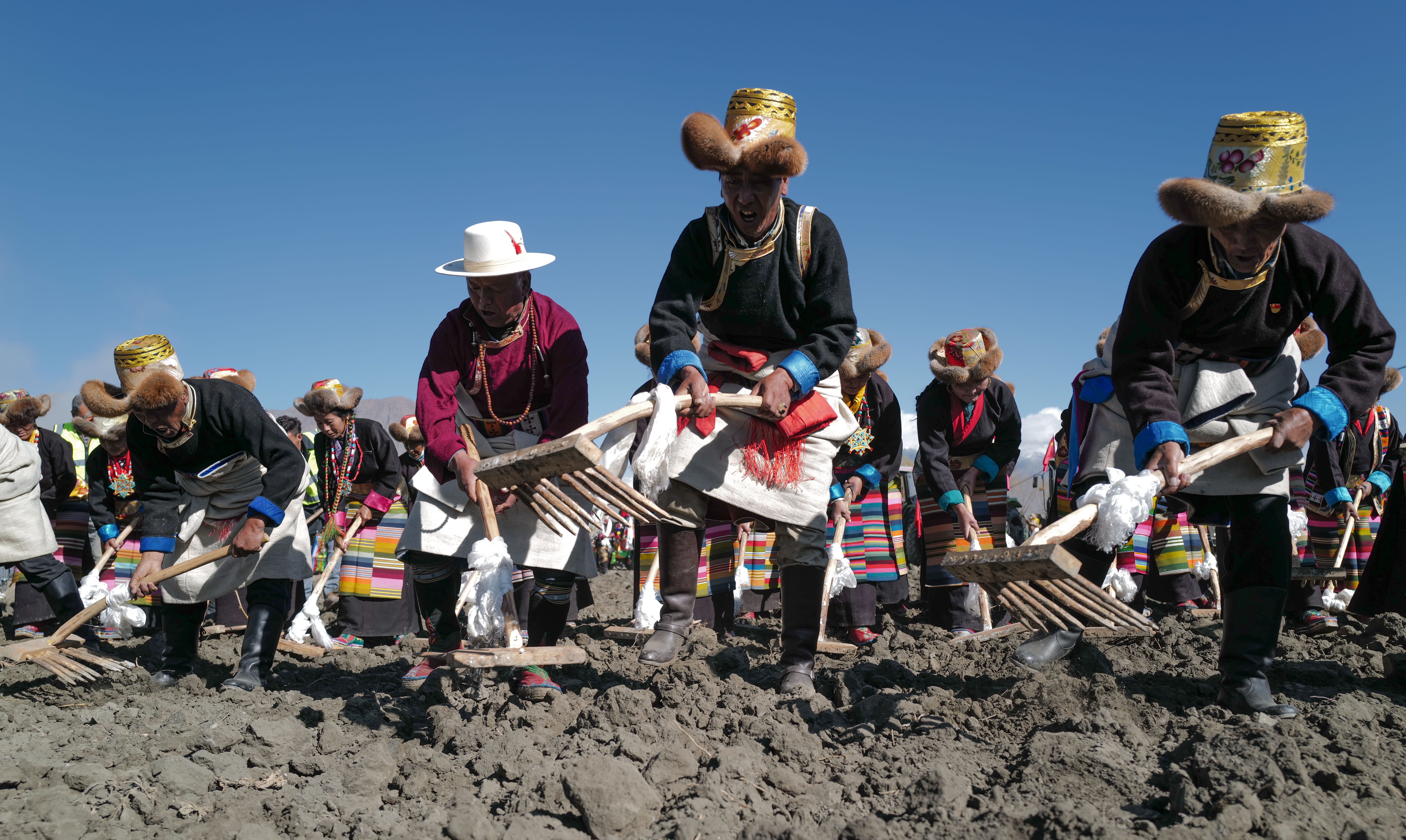 3月16日,西藏山南市乃東區(qū)克松社區(qū)居民參加春耕儀式。新華社記者 孫瑞博 攝