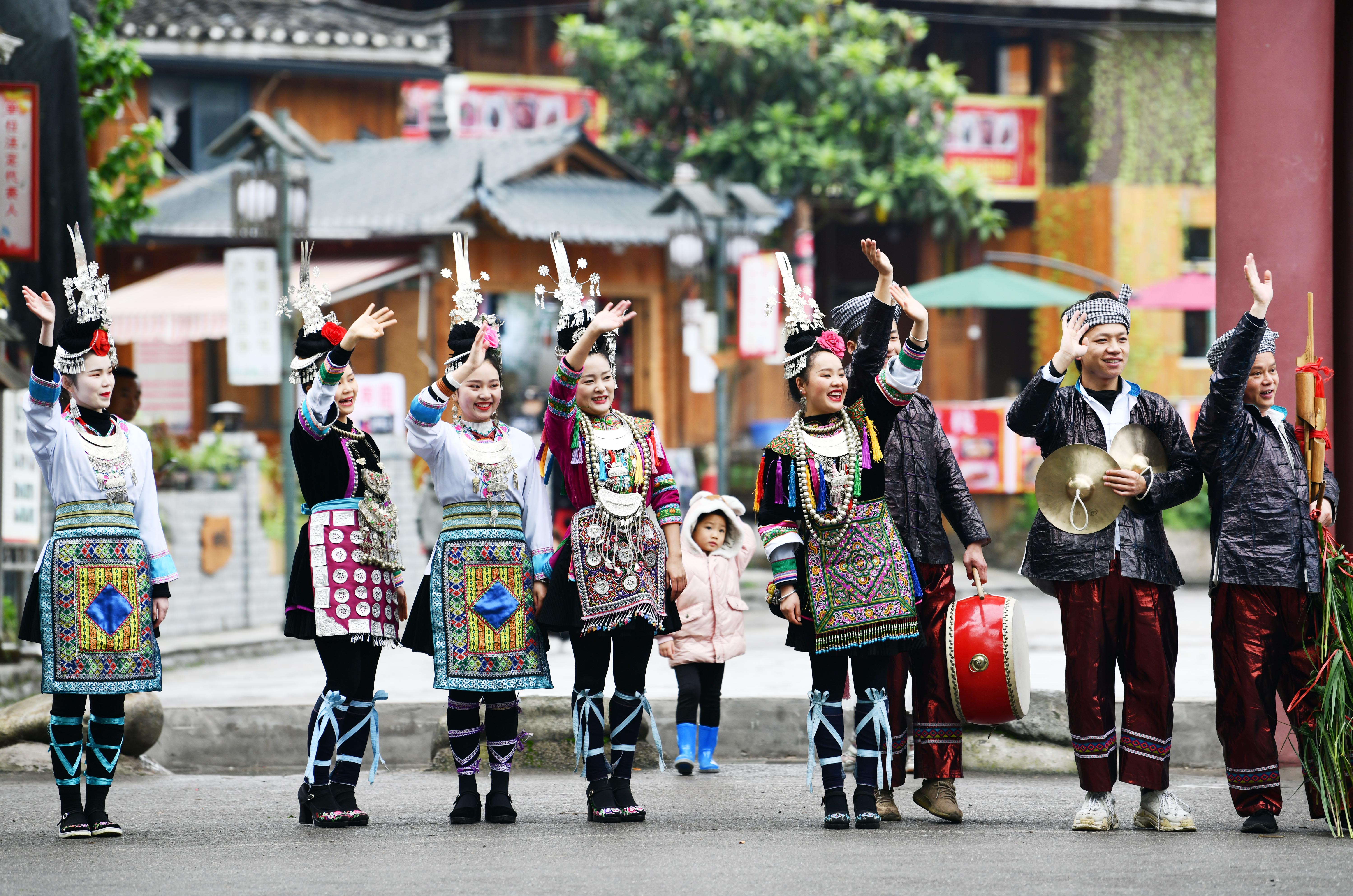 4月10日,在貴州省江口縣寨沙侗寨,演員和村民送別游客。新華社記者 楊文斌 攝