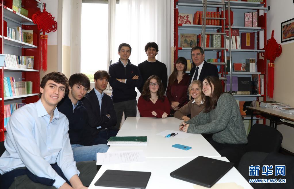 意大利羅馬國立住讀學(xué)校校長雷亞萊(后排右一)與致信習(xí)近平主席的學(xué)生們在一起(2019年3月18日攝)。新華社記者 程婷婷 攝