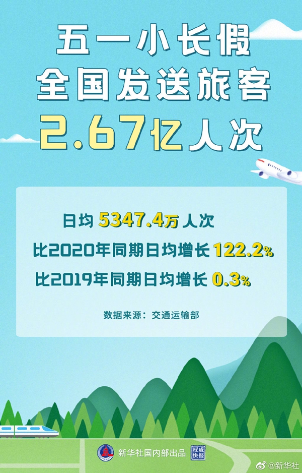 記者5日從交通運(yùn)輸部獲悉,“五一”假期,全國(guó)鐵路、公路、水路和民航預(yù)計(jì)共發(fā)送旅客2.67億人次,日均5347.4萬(wàn)人次,比去年同期日均增長(zhǎng)122.2%。