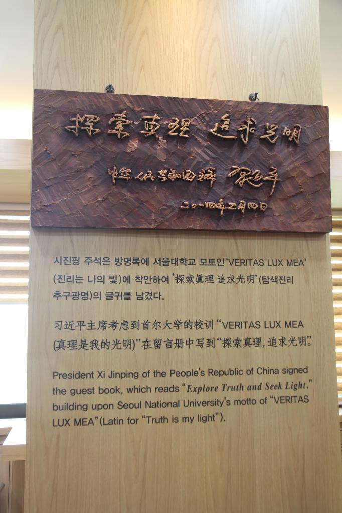 “探索真理,追求光明”——習近平主席的親筆題詞就刻印在圖書資料室入口處。這句題詞與首爾大學校訓“真理是我的光明”異曲同工,承載著對中韓兩國青年互學互鑒、成德成才的殷殷期盼。