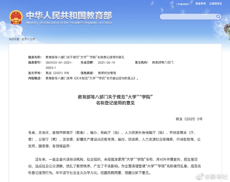 教育部等八部門近日印發(fā)意見,規(guī)范大學學院名稱登記使用。教育部表示,一些企業(yè)內設培訓機構、社會組織,未經(jīng)批準冒用“大學”“學院”名稱,并對外開展宣傳、招生等活動,造成社會公眾誤解,擾亂了教育秩序。意見明確,“大學”“學院”名稱經(jīng)審批方可使用。大學由國務院教育行政部門依法審批或備案;學院根據(jù)辦學層次、類型、法人性質等,由中央和國家有關部門或省級人民政府及其有關部門依法審批。涉及機構編制事項的,按照機構編制管理權限和規(guī)定程序,報機構編制部門審批。(記者胡浩)
