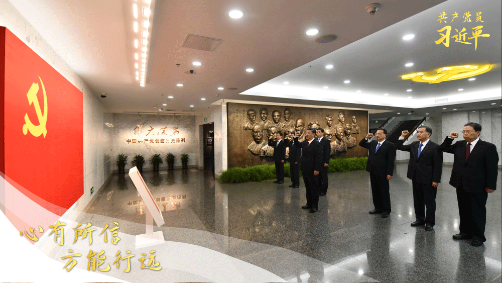 人們記得,黨的十九大閉幕不久,在中共一大會(huì)址紀(jì)念館一層序廳,面對(duì)如鮮血浸染的巨幅黨旗,習(xí)近平帶領(lǐng)其他中共中央政治局常委同志一道舉起右拳,莊嚴(yán)宣誓: