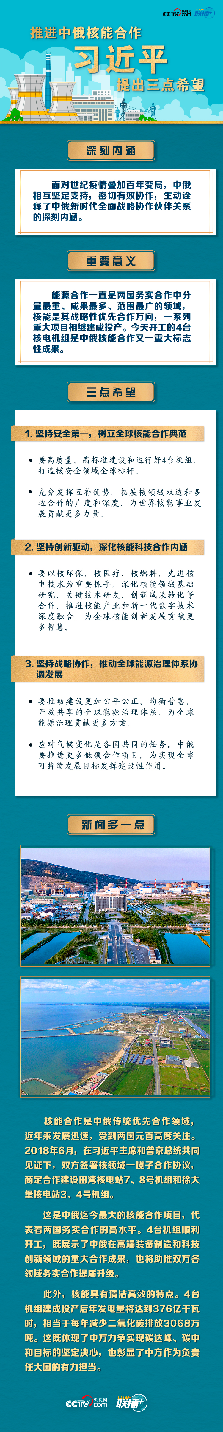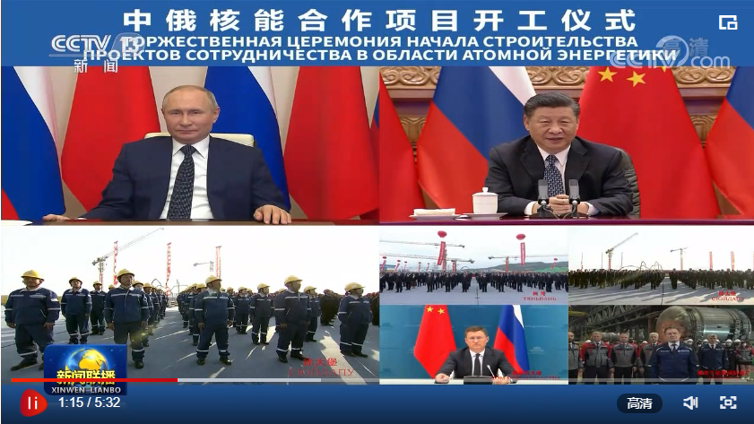 聯(lián)播+“今年是《中俄睦鄰友好合作條約》簽署20周年。我同普京總統(tǒng)商定,將在更高水平、更廣領(lǐng)域、更深層次推進雙邊關(guān)系向前發(fā)展。”5月19日,習(xí)近平主席在北京通過視頻連線,同俄羅斯總統(tǒng)普京共同見證兩國核能合作項目——田灣核電站和徐大堡核電站開工儀式。