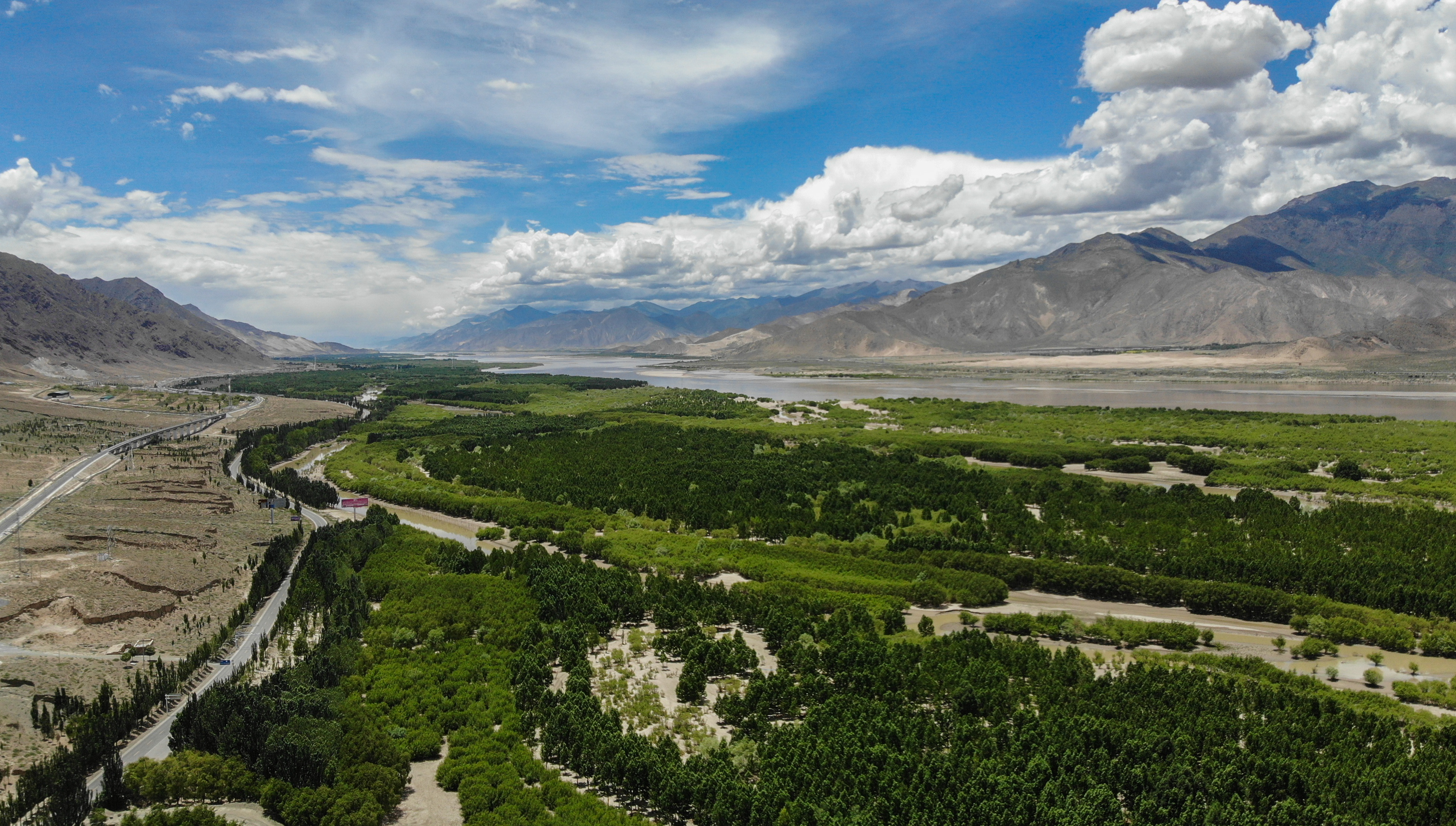 ↑雅魯藏布江岸邊綠樹成蔭,好似一道綠色長廊(2020年6月27日攝,無人機照片)。