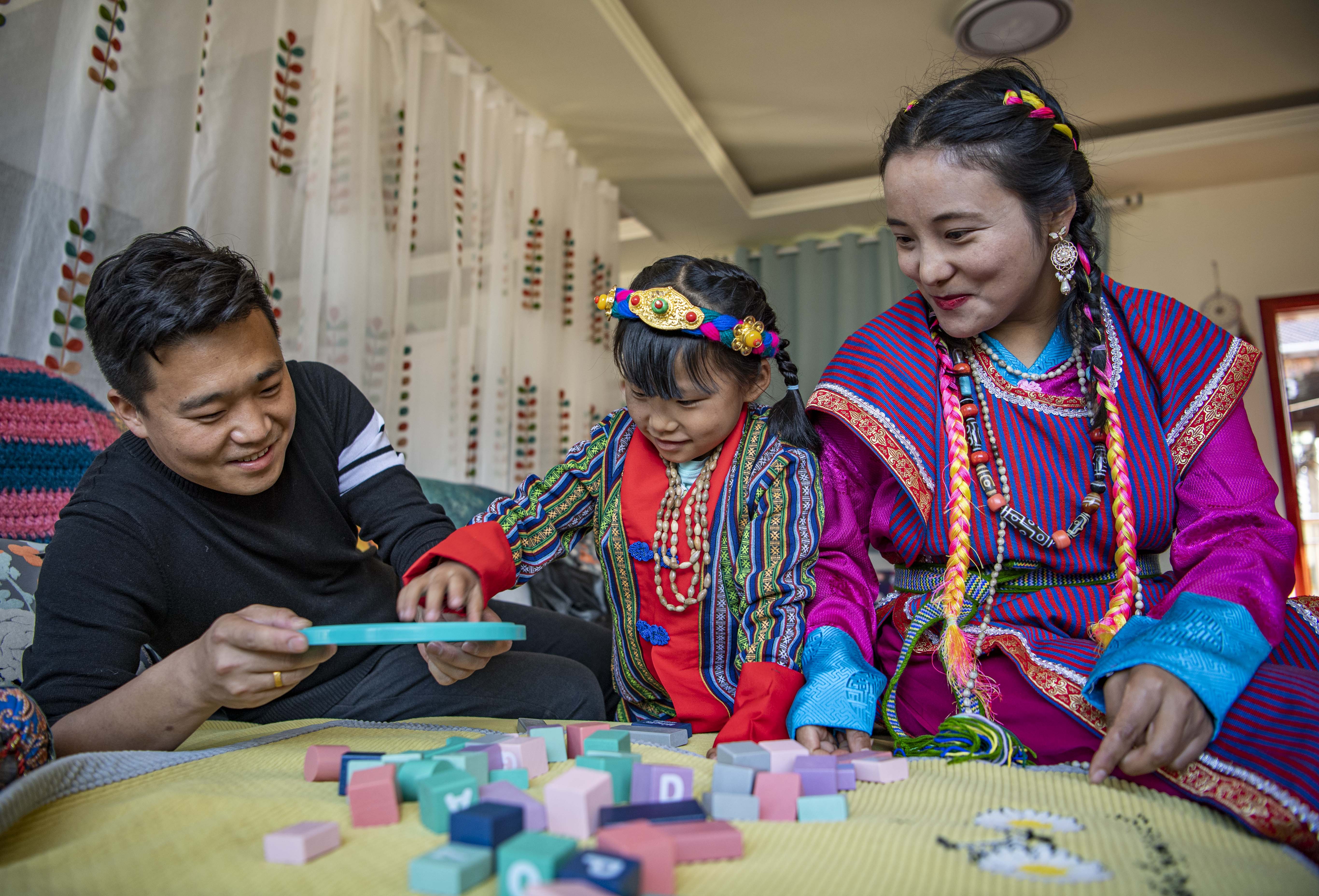 ↑2021年2月11日,在位于西藏林芝市墨脫縣的家中,山西小伙張淳煥和門巴族妻子扎西玉珍陪女兒玩積木。