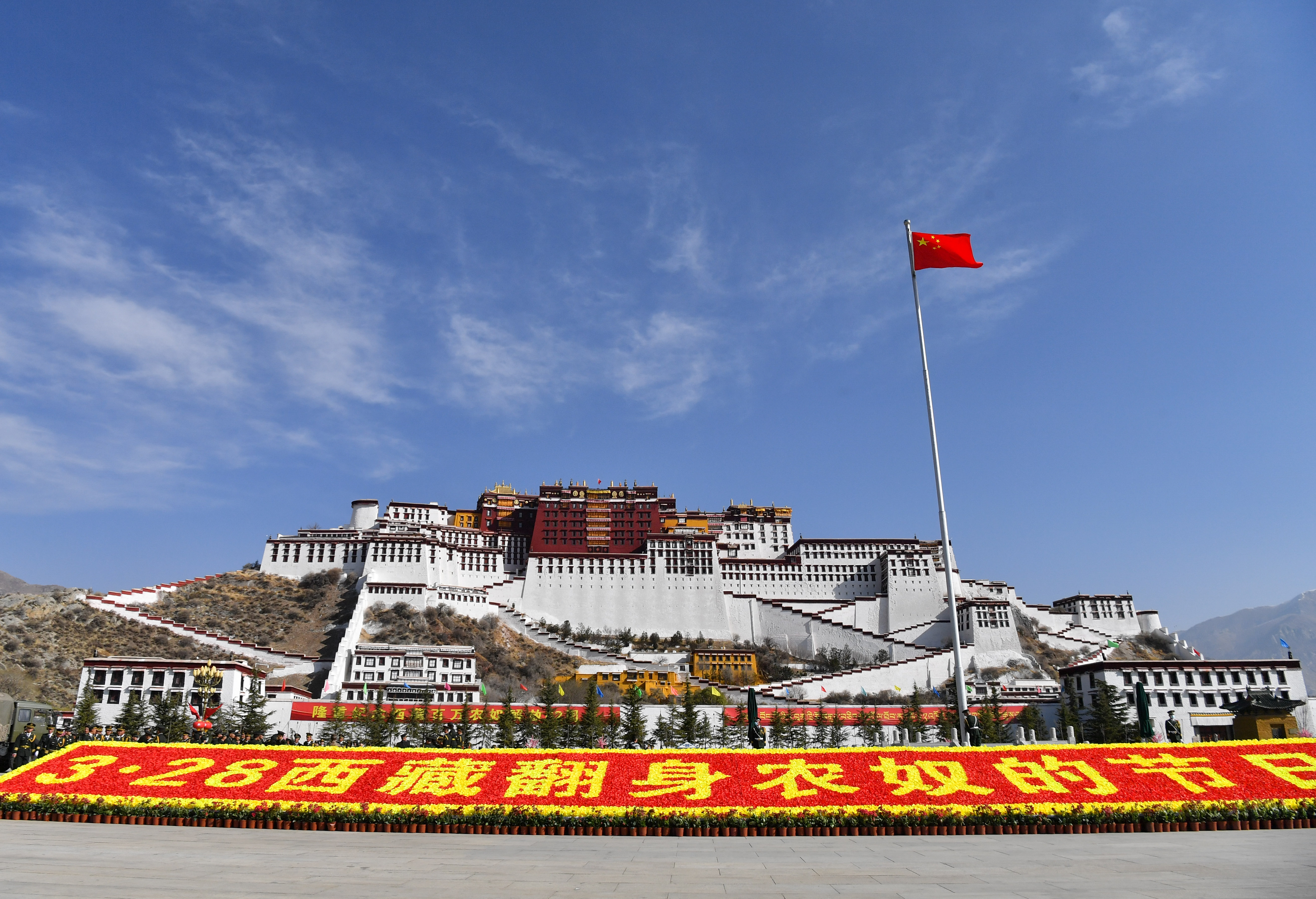 ↑2021年3月28日拍攝的拉薩布達拉宮廣場。當日,西藏各族各界群眾慶祝西藏百萬農(nóng)奴解放紀念日。