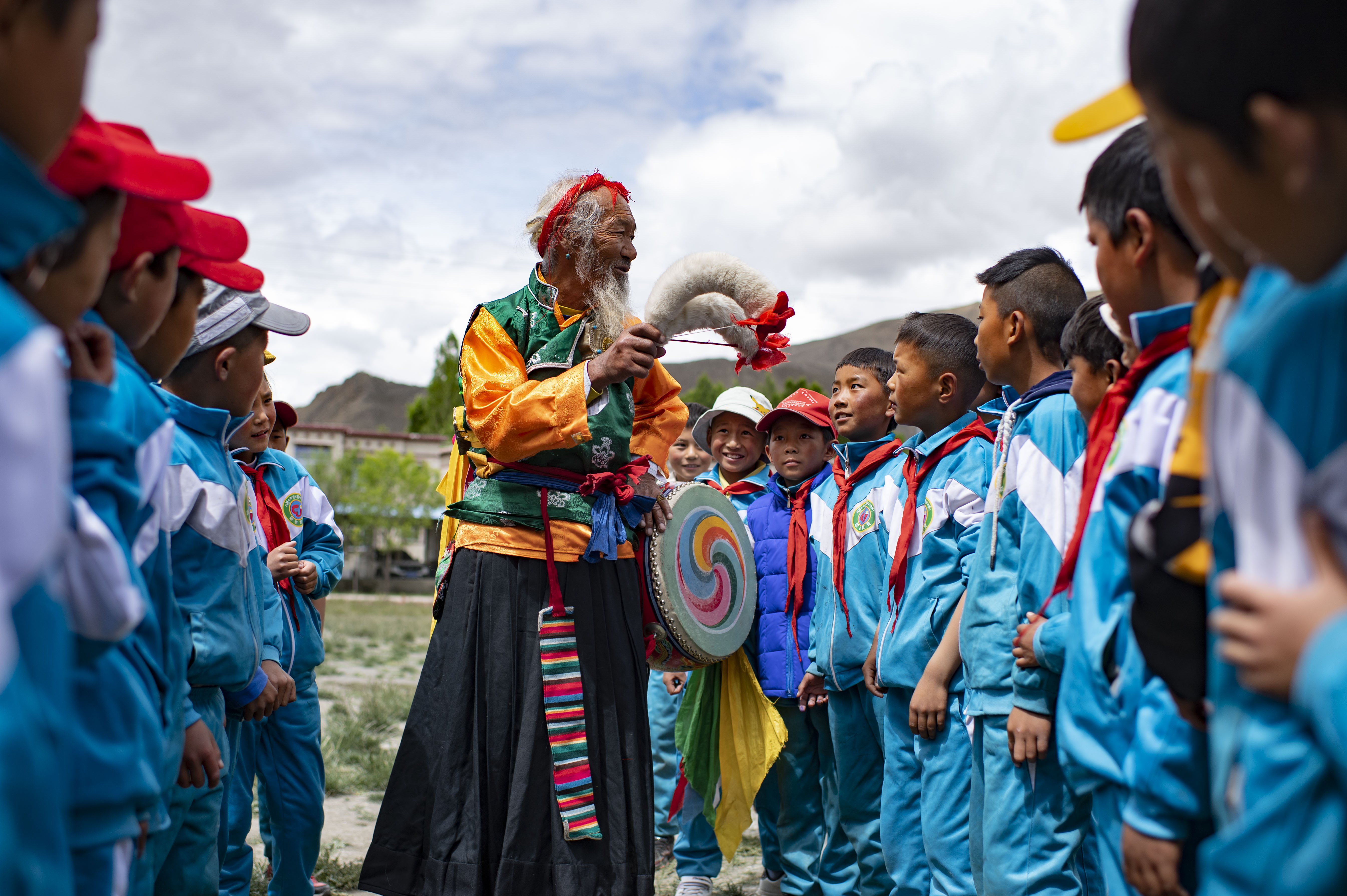 ↑2020年7月2日,國家級非物質(zhì)文化遺產(chǎn)項目“久河卓舞”傳承人尼瑪在西藏山南市瓊結(jié)縣下水鄉(xiāng)小學(xué)進行教學(xué)表演。