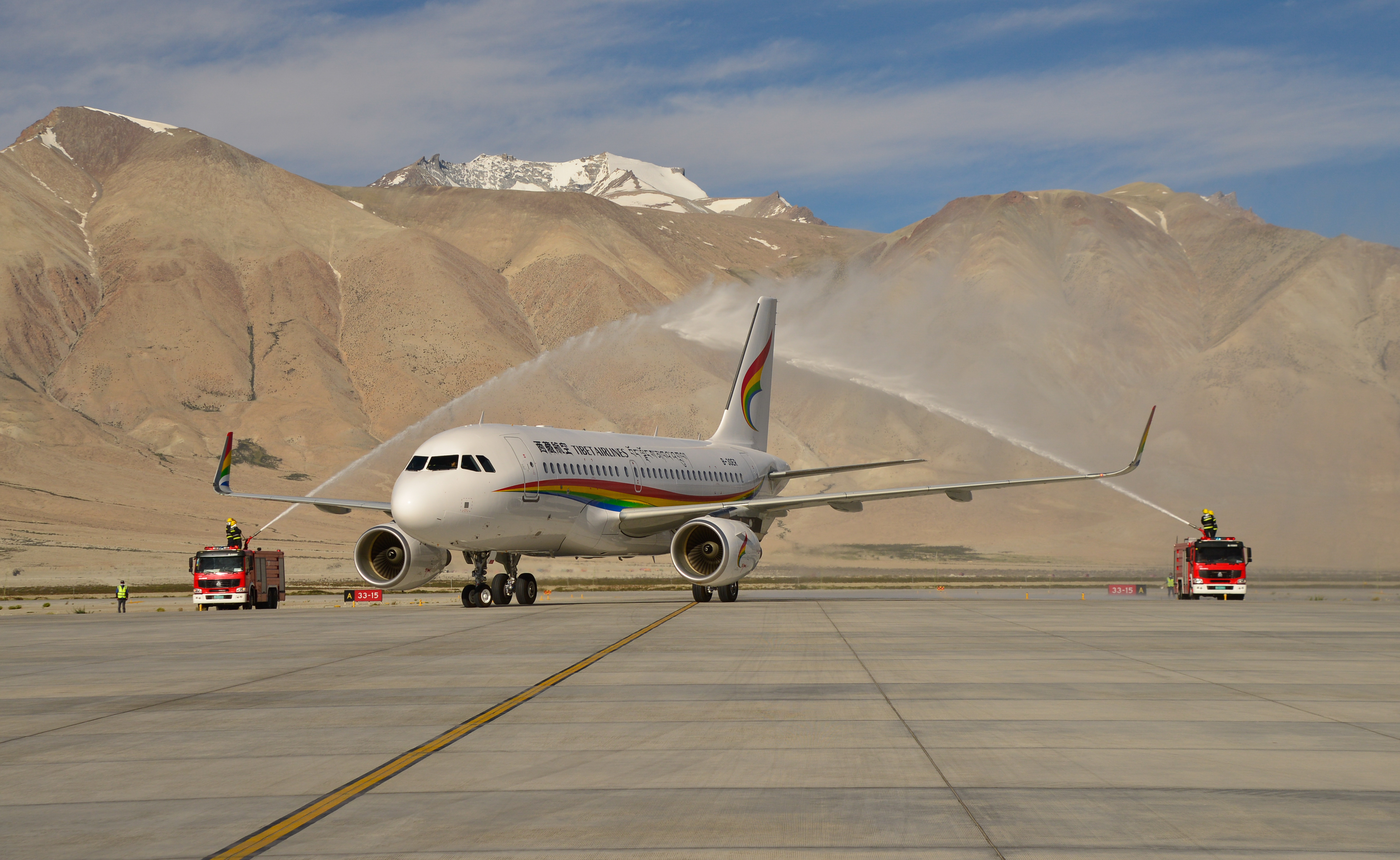 ↑2020年7月1日,阿里昆莎機場通航10周年,西藏航空TV6008客機穿過水門。