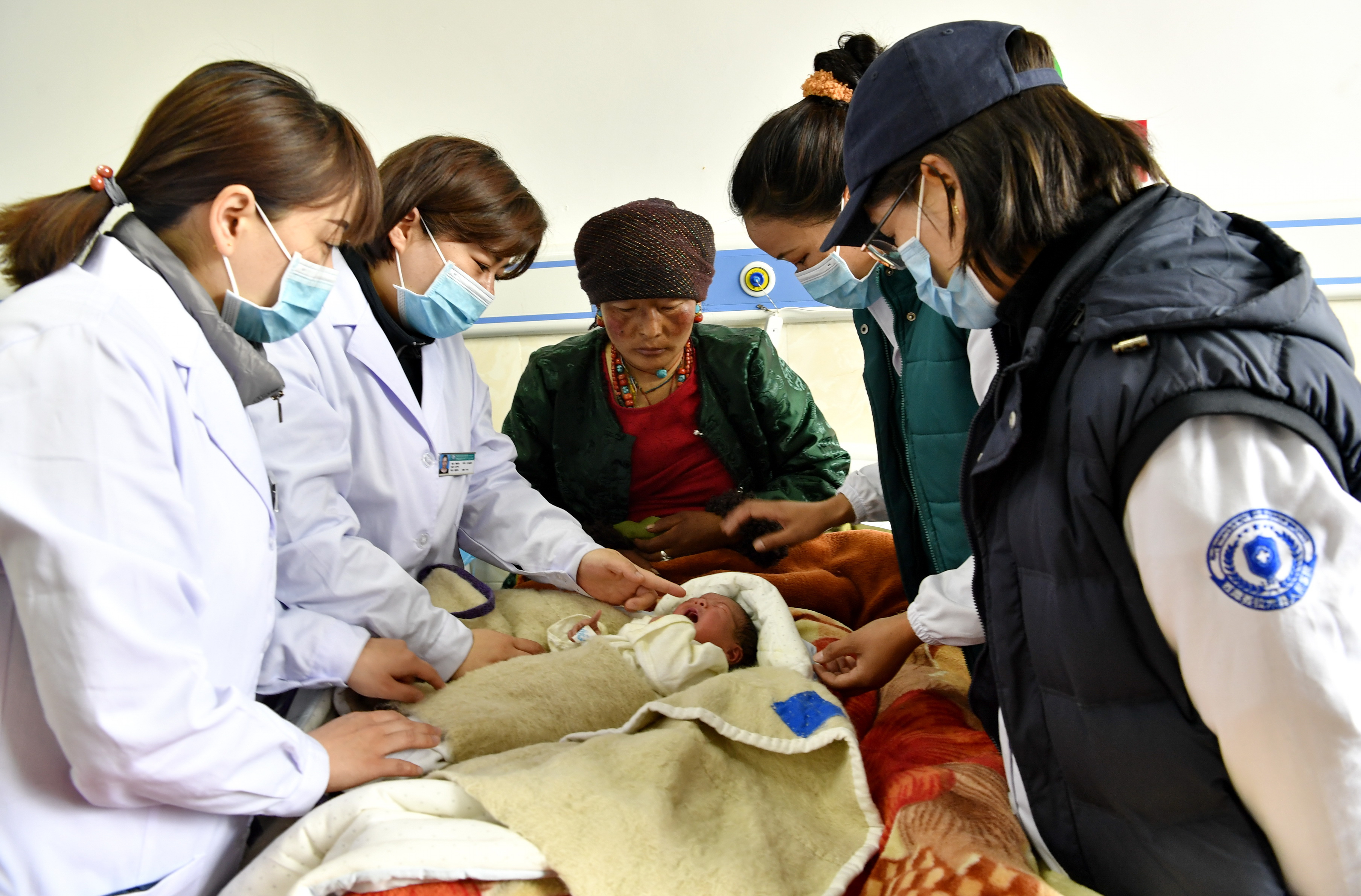↑2021年4月21日,在西藏聶拉木縣人民醫(yī)院,山東省煙臺市第五批援藏醫(yī)療隊隊長魏德賢(左二)、護士長崔雯(左一)和當?shù)蒯t(yī)院婦產(chǎn)科主任邊巴普尺(右二)、婦產(chǎn)科醫(yī)生扎桑德吉(右一)查房。