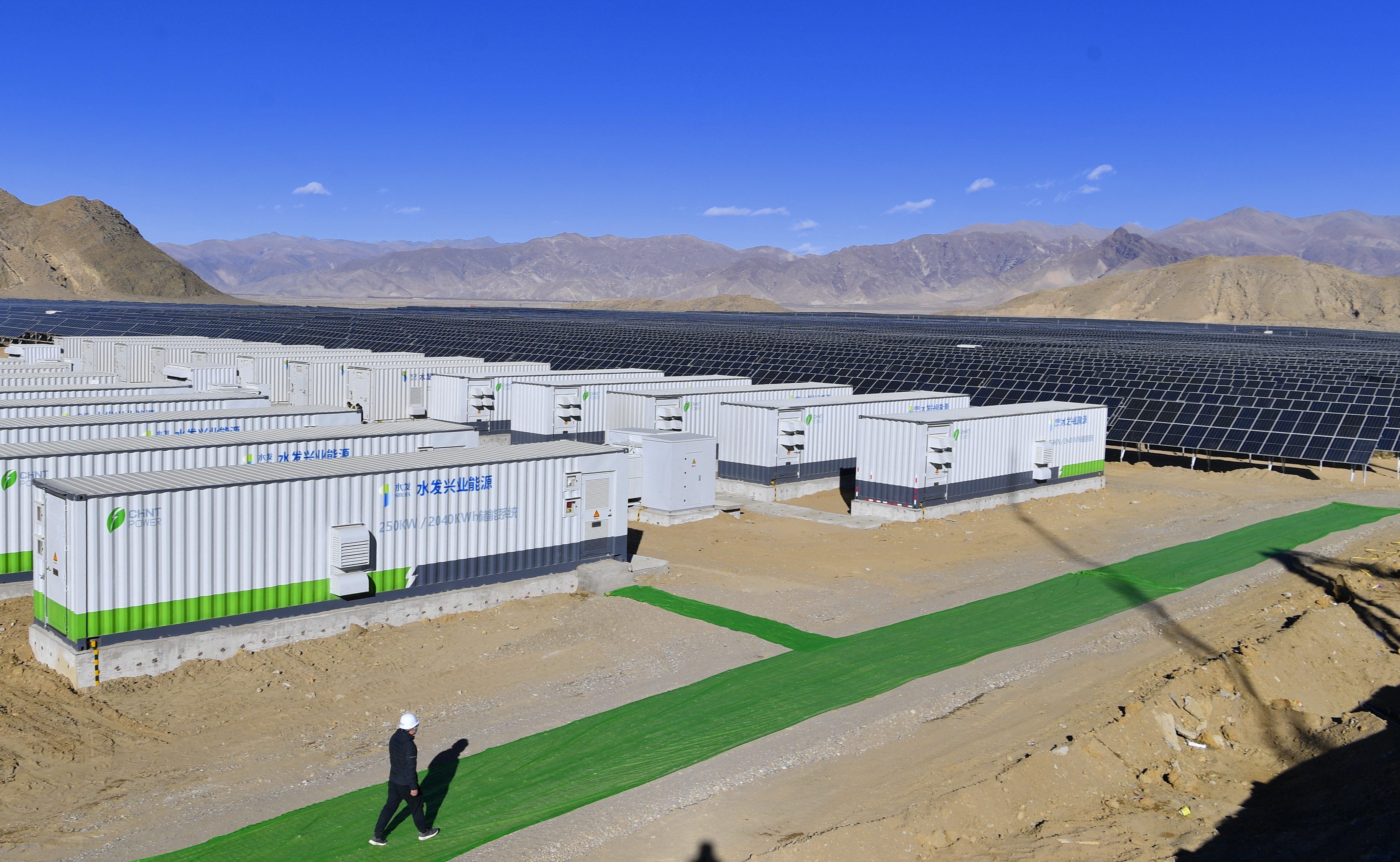 ↑2020年12月24日拍攝的日喀則市江當現(xiàn)代生態(tài)產(chǎn)業(yè)示范園內(nèi)的50兆瓦光儲電站儲能系統(tǒng)和太陽能光伏組件。