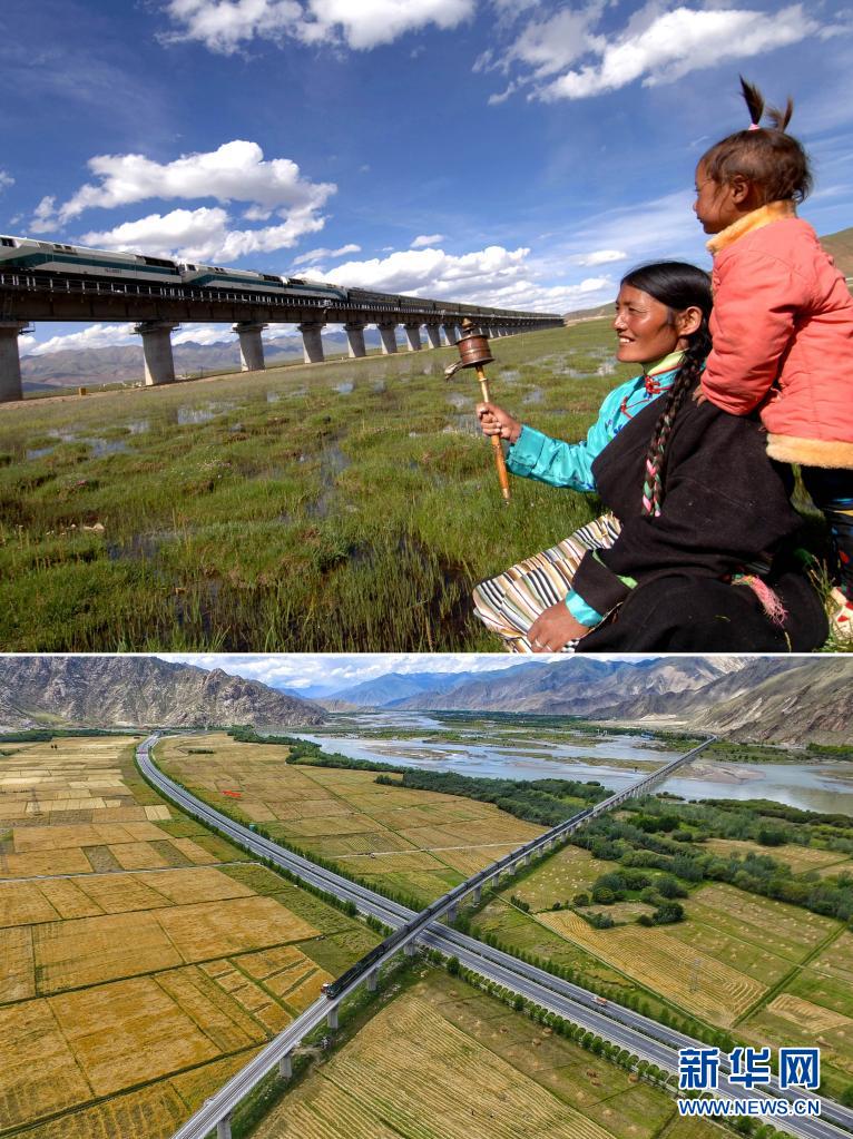 這是一張拼版照片:上圖為西藏當(dāng)雄縣藏族群眾在觀看火車駛過(2006年6月17日 新華社記者覺果攝);下圖為在西藏拉薩市曲水縣拍攝的公路與鐵路(2016年8月17日新華社記者普布扎西攝 無人機(jī)照片),西藏已形成了公路、鐵路、航空的立體交通網(wǎng)絡(luò)。新華社發(fā)