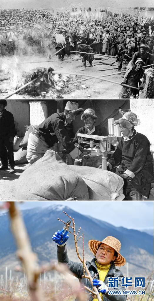 這是一張拼版照片:上圖為1959年8月,西藏墨竹工卡縣的翻身農(nóng)奴焚燒三大領(lǐng)主的剝削文契(新華社發(fā));中圖為1984年,江孜縣農(nóng)民洛桑旺堆(左)向國家出售余糧。他家承包土地100多畝,農(nóng)忙種地,農(nóng)閑搞建筑、跑運(yùn)輸(新華社記者土登攝);下圖為2020年3月22日,西藏林芝現(xiàn)代蘋果標(biāo)準(zhǔn)化示范園的工作人員為桃樹剪枝。該示范園實(shí)施農(nóng)機(jī)農(nóng)藝結(jié)合、水肥一體化及“果草畜循環(huán)”,大面積推廣蘋果矮砧集約高效栽培技術(shù),帶動(dòng)米林縣羌納鄉(xiāng)林巴、才巴、色沃村及附近的農(nóng)戶增收(新華社記者 張汝鋒 攝)。新華社發(fā)