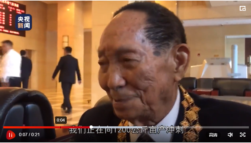 現(xiàn)場視頻顯示,習(xí)近平和袁隆平在臺(tái)上進(jìn)行了簡短交流。袁隆平在接受采訪時(shí)告訴記者:“總書記問我,有什么進(jìn)展?我說,我們正在向1200公斤畝產(chǎn)沖刺!”