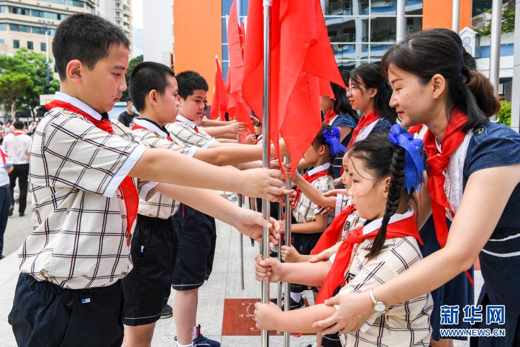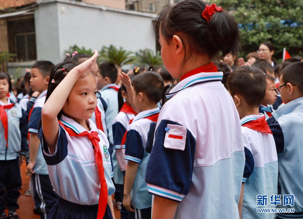 5月31日,南寧市濱湖路小學(xué)的學(xué)生參加入隊(duì)儀式。新華社記者 曹祎銘 攝