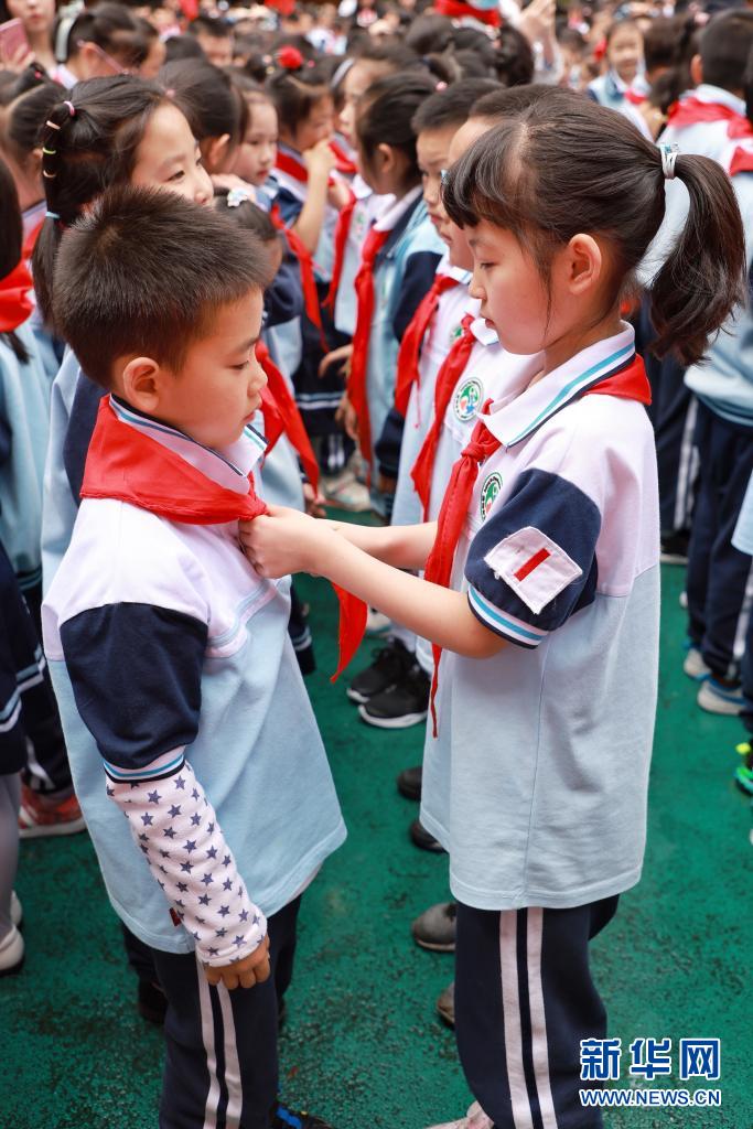 5月31日,高年級(jí)的少先隊(duì)員在入隊(duì)儀式上為新入隊(duì)的同學(xué)系紅領(lǐng)巾。新華社記者 劉續(xù) 攝