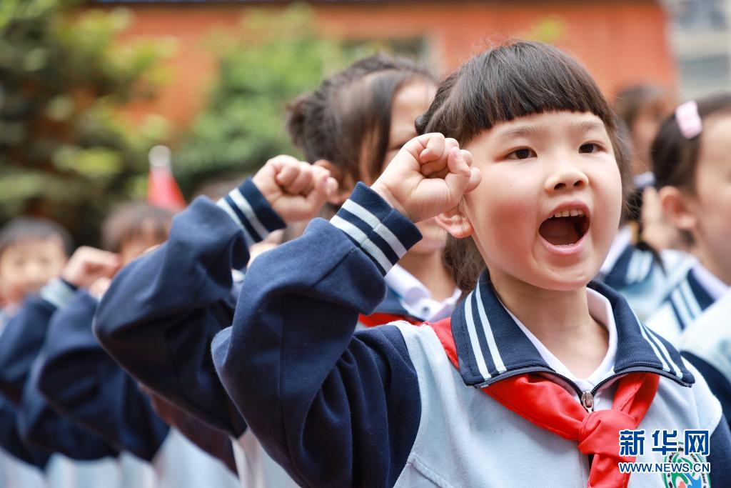5月31日,四川省華鎣市高興鎮(zhèn)小學(xué)少先隊(duì)新隊(duì)員在入隊(duì)儀式上宣誓。新華社發(fā)(邱海鷹 攝)