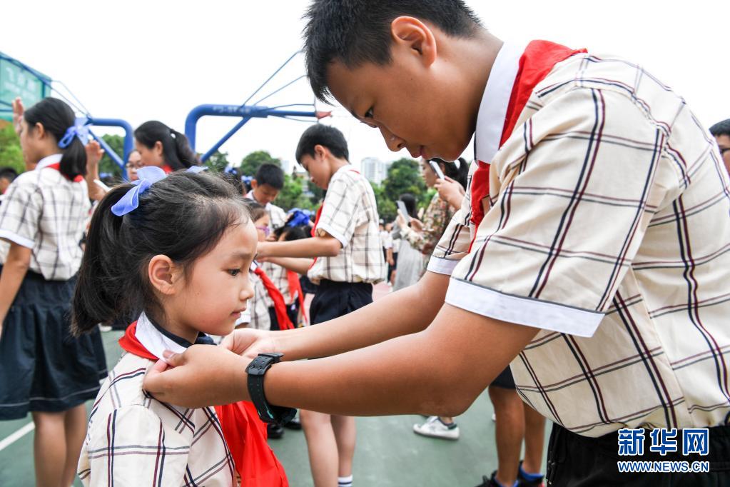 5月31日,南寧市濱湖路小學(xué)高年級(jí)的少先隊(duì)員在入隊(duì)儀式上為新入隊(duì)的同學(xué)系紅領(lǐng)巾。新華社記者 曹祎銘 攝